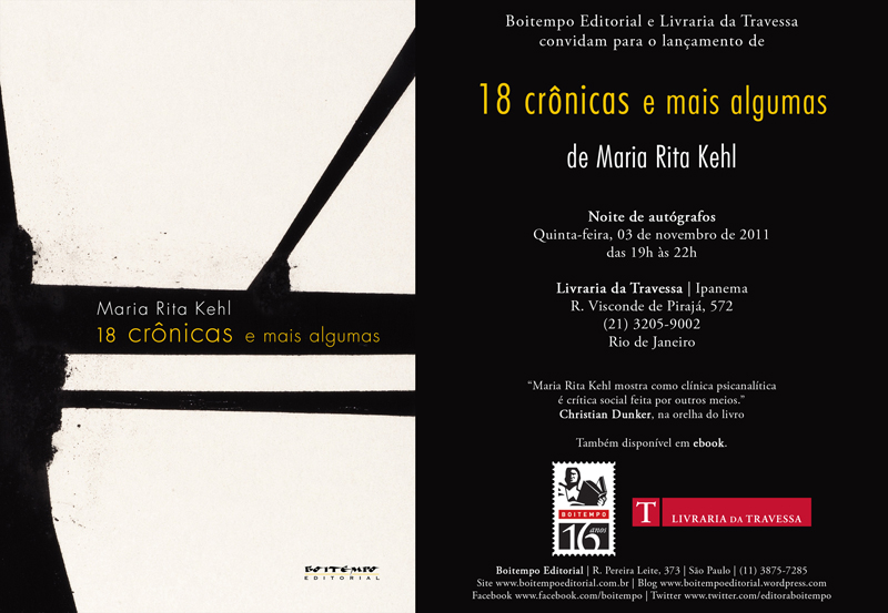 Para divulgar o lançamento e a obra da psicanalista, sortearemos um exemplar de 18 crônicas e mais algumas. Para participar, o leitor deve divulgar ao menos um dos textos de Maria Rita Kehl publicados no Blog da Boitempo esta semana, utilizando os endereços: