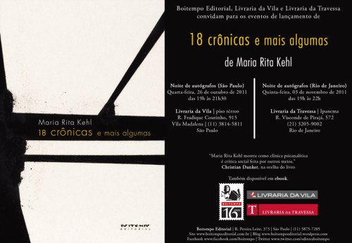Maria Rita Kehl participará de duas noites de autógrafo de seu novo livro, 18 crônicas e mais algumas: em São Paulo, na Livraria da Vila (26/10, às 19h) e no Rio de Janeiro, na Livraria da Travessa (03/11, às 19h). O livro já está à venda nas livrarias e em ebook no Gato Sabido e na Livraria Cultura.