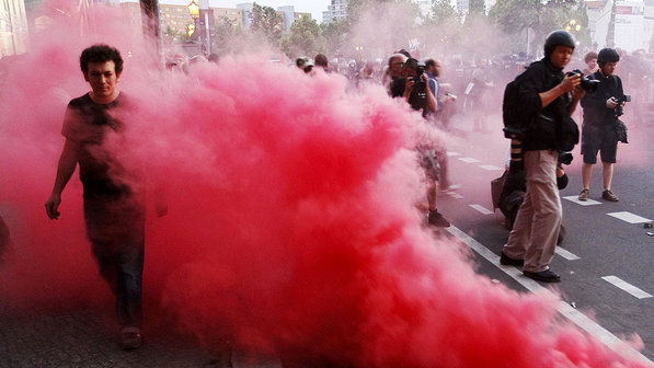 Do lado dos manifestantes, os mesmos rituais de sempre. Vestidos de preto, a maioria com capuzes do tipo chapeuzinho vermelho, óculos escuros desses que nada deixam ver, alguns já de lenço no rosto ou no queixo, a maioria afeta um ar nervoso de grandes decisões. Olhares fixos, daqueles que antecedem as grandes batalhas. Uma enorme faixa, à frente, cobre-lhes os corpos e nos mais das vezes os rostos. Tudo muito elétrico.