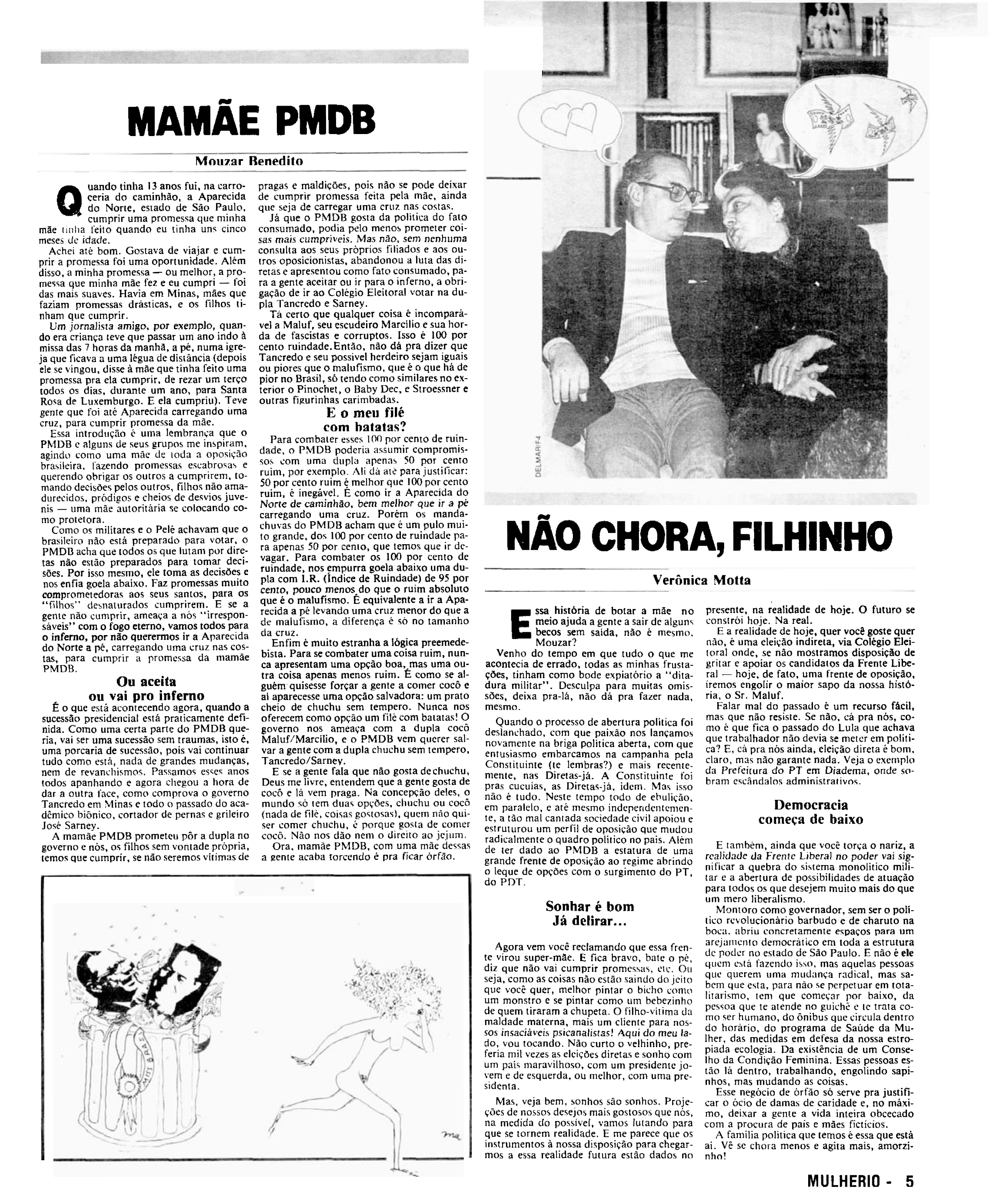Nessa época, irritado, publiquei um artigo no jornal Mulherio, sobre o assunto. Continuo com as mesmas posições. Mas muitos dos meus antigos ex-companheiros de partido mudaram. Usam as mesmas práticas, defendem o voto útil, ameaçam. O maior dos males também mudou. É hoje um pessoal de bico comprido que na época era do PMDB. Vale até se aliar com Maluf, contra eles.