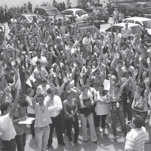 Teleoperadores recusam proposta do sindicato patronal (Sintelmark) e assembleia decide pela paralisação em São Paulo. Sindicato dos Trabalhadores em Telecomunicações no Estado de São Paulo – Sintetel-SP. 2 de março de 2011. A fotografia integra o caderno de imagens de A política do precariado, de Ruy Braga.