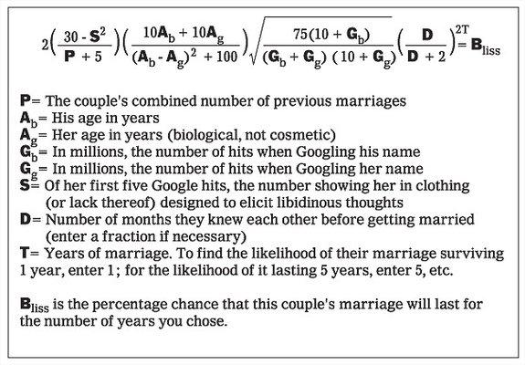 “Cientistas do Instituto de Pesquisas de Relacionamento, apelidado de ‘Laboratório do Amor’, dizem ter criado um modelo matemático que pode prever quais relacionamentos terminarão em divórcio. O psicólogo John Gottman e os matemáticos James Murray e Kistin Swanson alegam que suas previsões têm 94% de precisão…”.