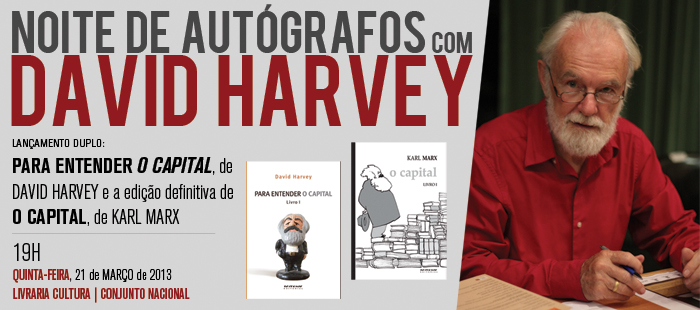 David Harvey está no Brasil para participar do IV Seminário Margem Esquerda, que integra a programação do projeto Marx: a criação destruidora. Hoje, o geógrafo participa de uma noite de autógrafos de lançamento de Para entender ‘O capital’. O evento também marca o lançamento da edição definitiva d’O capital, de Karl Marx.