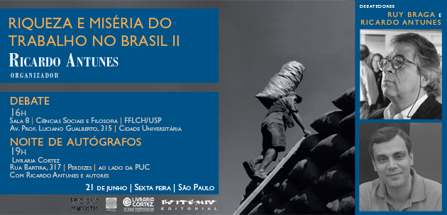 Ruy Braga participará de debate de lançamento de Riqueza e miséria do trabalho no Brasil II, com o coordenador da obra, Ricardo Antunes, na próxima sexta-feira, 21 de junho, às 16h na Sala 8 do Prédio de Ciências Sociais da FFLCH/USP. Após o debate, haverá noite de autógrafos com os autores do livro na Livraria Cortez.