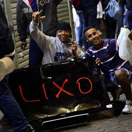 É estranho que o espancamento de manifestantes seja tratado como “confronto” e o ataque a símbolos da ostentação capitalista seja algo violento. É só assim que a desumanização do discurso burguês chega ao paroxismo. A reunião para protestar nas ruas torna-se formação de quadrilha, especialmente se pretende denunciar a verdadeira quadrilha do PSDB que assaltou o Estado de São Paulo ou a administração desavergonhada de Cabral no Rio de Janeiro.