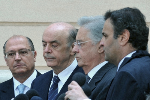 “O CAMAROTE VIP DO ITAÚ“: Geraldo Alckmin, José Serra, Fernando Henrique Cardoso e Aécio Neves em convenção do PSDB que lançou o candidato tucano à presidência da república em 2014.