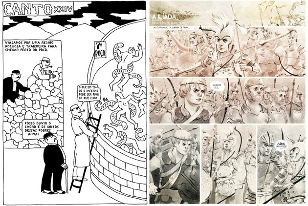 Divina Comédia, de Dante Alighieri, no traço de Seymour Chwast (esq.) e Ilíada, de Homero, no traço de Alice Duke (dir.)