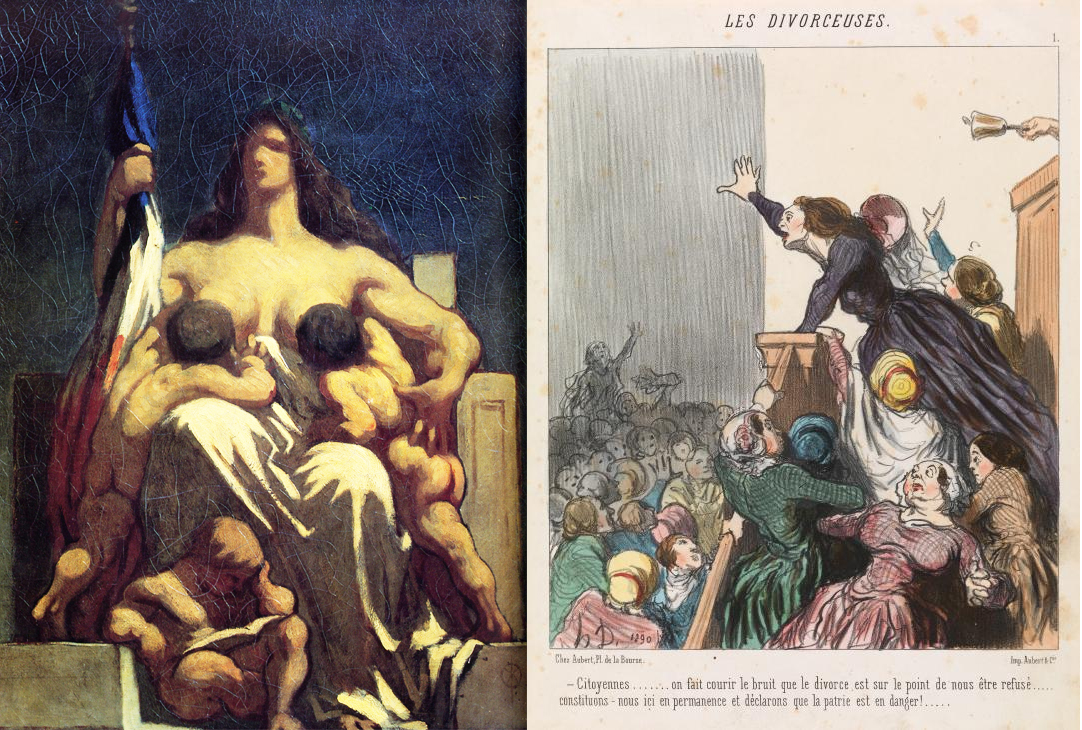 “A República” [à esquerda], de Daumier, foi encomendada para representar as virtudes do republicanismo: a figura feminina robusta portando a bandeira tricolor e rodeada de crianças se nutrindo e se educando trabalha a ideia de um corpo político provedor. Ironicamente, o quadro ficou pronto justamente em 1848, ano em que Daumier esboçou a charge “Les divorcés” [à direita], retratando a luta pelo direito ao divorcio e captando os temores burgueses da ocupação do espaço político pelas mulheres. Ambas as ilustrações integram o livro Paris, capital da modernidade, de David Harvey (Boitempo, 2015). [Nota do editor].