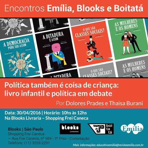 Semana que vem o debate é em São Paulo! No sábado, dia 30 de abril, Thaisa Burani participa de um debate com Dolores Prades na livraria Blooks do Shopping Frei Caneca. Intitulado “Livro infantil e política em debate”, a mesa integra a série de encontros abertos promovidos pela Revista Emília para discutir literatura infantil hoje a sério. Não perca: saiba mais sobre o evento clicando aqui.