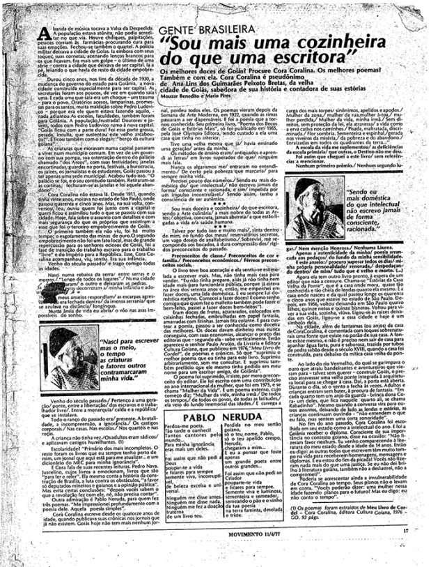 Segundo me contaram, foi a primeira matéria sobre Cora Coralina publicada fora do estado de Goiás. A poetisa só se tornou famosa nacionalmente depois que Carlos Drummond de Andrade publicou uma matéria sobre ela no Jornal do Brasil, em 1979.