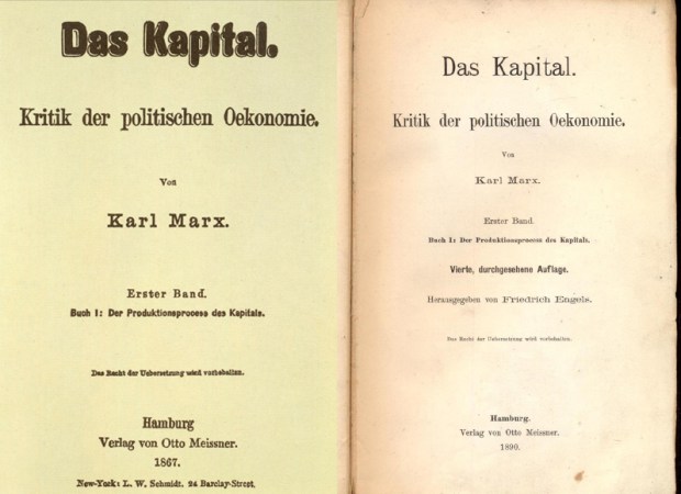 Folha de rosto da primeira edição do Livro I de O capital, publicada por Otto Meissner em datada de 1867; à esquerda, a folha de rosto da quarta edição, datada de 1890, também publicada por Otto Meissner, em Hamburgo, mas arrematada sob os auspícios de Friedrich Engels.