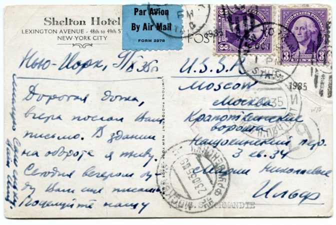 Cartão postal de Ilya Ilf a sua esposa. Enviado de Nova York no dia 9 de outubro de 1935. O carimbo “The Huge Shelton Hotel” indica a estadia dos russos em Manhattan.