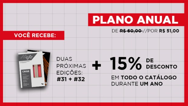 No plano anual, você recebe as duas próximas edições da revista: a #31, do segundo semestre de 2018 e a #32, do primeiro semestre de 2019. Além do desconto de 10% sobre o preço de capa da revista (R$60,00 por R$54,00), você terá durante esse período de um ano, um desconto de 15% em todo o catálogo da Boitempo, através do nosso site.