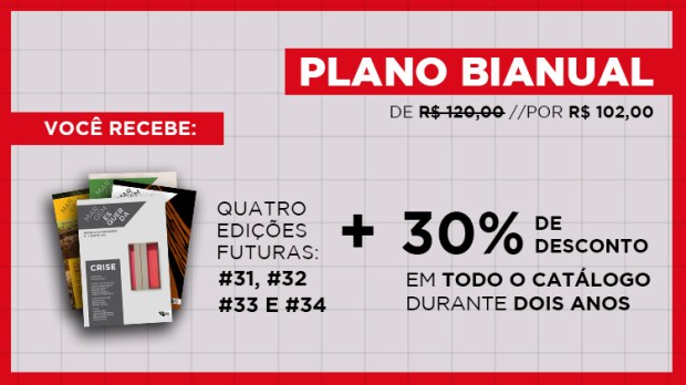 No plano bianual, você recebe as quatro próximas edições da revista: a #31, do segundo semestre de 2018, a #32 e a #33, de 2019, e a #34 de 2020. Além do desconto de 15% sobre o preço de capa da revista (R$120,00 por R$102,00), você terá durante esse período de dois anos, um desconto de 30% em todo o catálogo da Boitempo, através do nosso site.