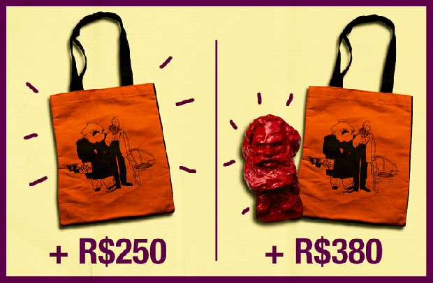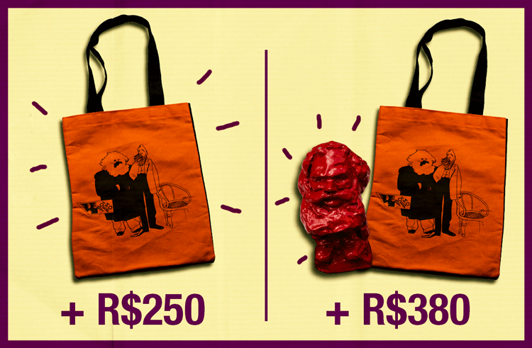 A bolsa Marx-Engels é feita de tecido laranja e preto traz caricatura original criada por Cássio Loredano, cujas ilustrações são reconhecidas por estampar as capas dos títulos da Coleção Marx-Engels. Se quiser comprar só a bolsa, clique aqui.