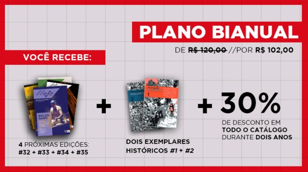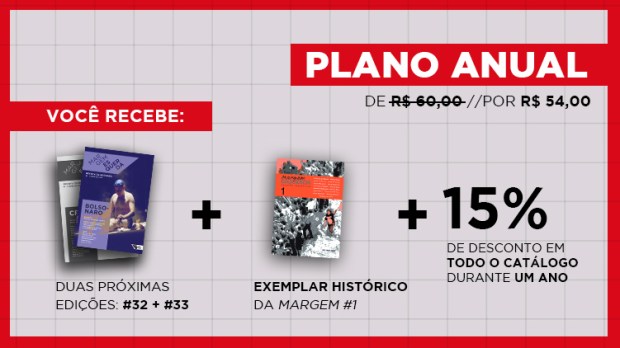 Fazendo a sua assinatura anual até o dia 16 de junho você recebe de presente duas edições históricas da revista: a Margem Esquerda nº 1 e a Margem Esquerda nº 2. Clique aqui ou na imagem abaixo para optar pelo plano bianual.