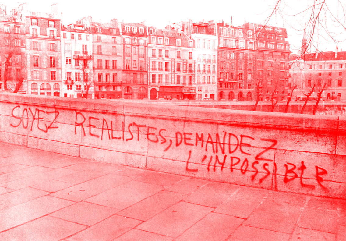 Soyez réalistes, demandez l’impossible” [Sejamos realistas, exijamos o impossível”], slogan de maio de 68, pichado em uma ponte parisiense. Foto de Gérard-Aimé, datada de 03.05.1968.