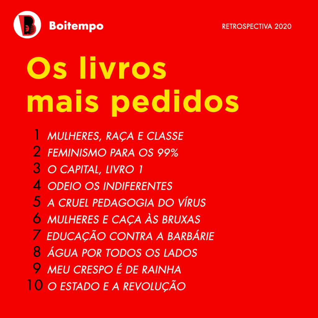 Você sabe dizer quais foram os maiores autores do ano? E a coleção mais pedida de 2020? Quer saber quais foram os textos mais lidos do Blog da Boitempo? E os vídeos mais vistos da TV Boitempo?