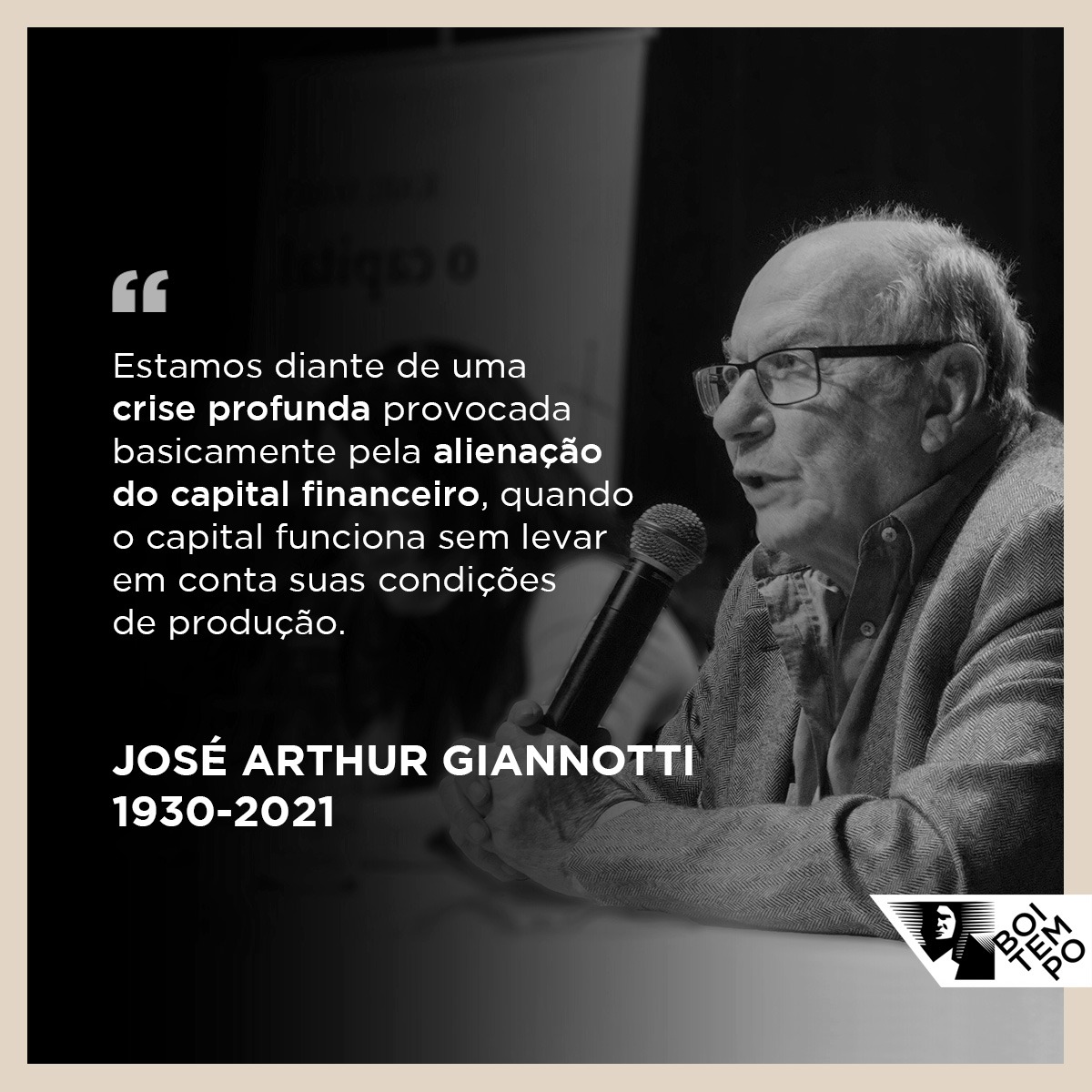 José Arthur Giannotti foi professor emérito da Faculdade de Filosofia, Letras e Ciências Humanas da Universidade de São Paulo, onde ingressou em 1950. Sua tese de livre-docência, Origens da dialética do trabalho, defendida na USP em 1965, foi orientada por Gilles Gaston Granger. Participou da fundação do Partido dos Trabalhadores, mas logo dele se afastou. É autor de Trabalho e reflexão (Brasiliense, 1983), O jogo do belo e do feio (Companhia das Letras, 2005), Lições de filosofia primeira (Companhia das Letras, 2011), coautor de Nós que amávamos tanto O capital (Boitempo, 2017) e autor do prefácio de O capital: crítica da economia política, Livro I, de Karl Marx (Boitempo, 2011).
