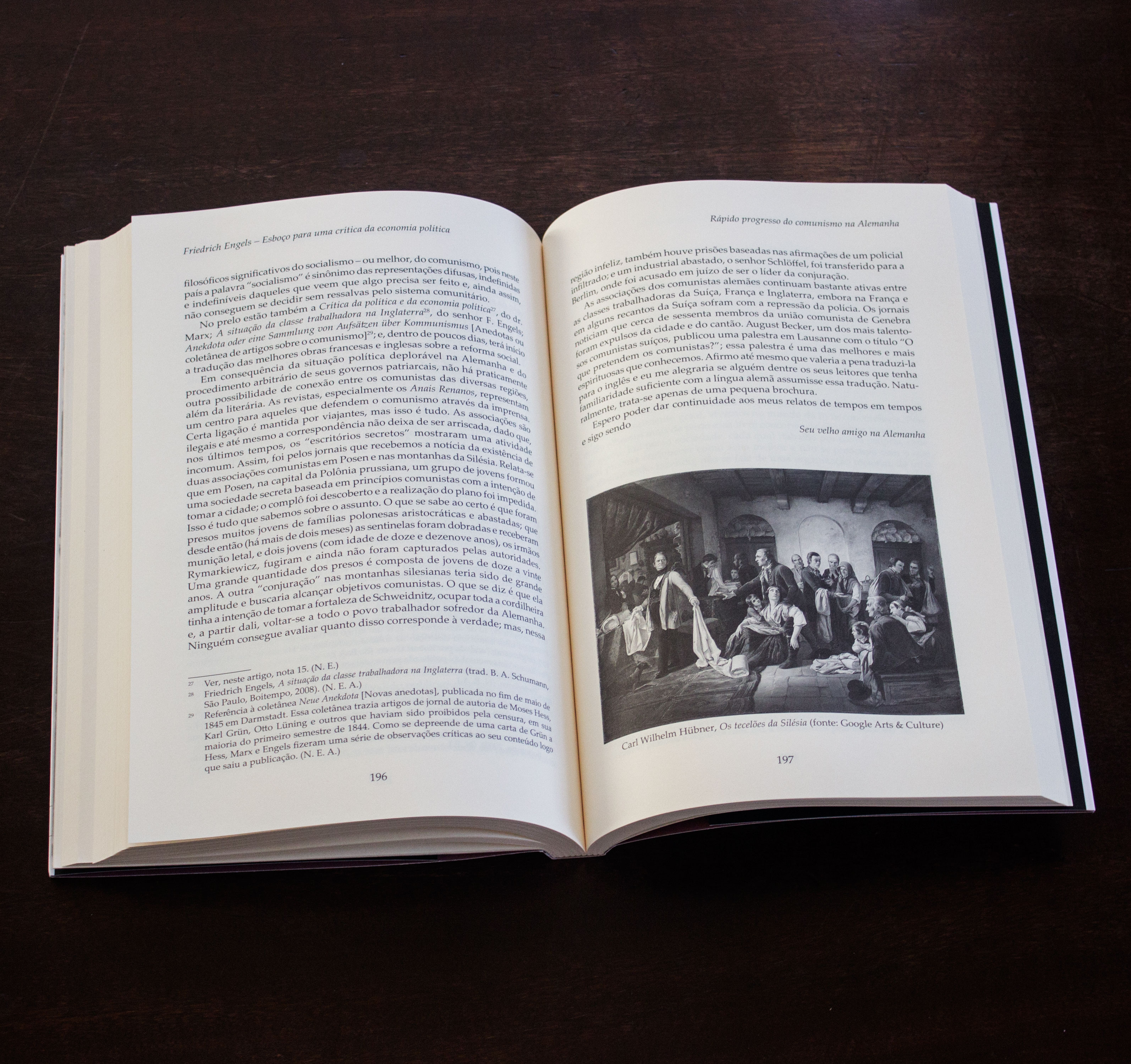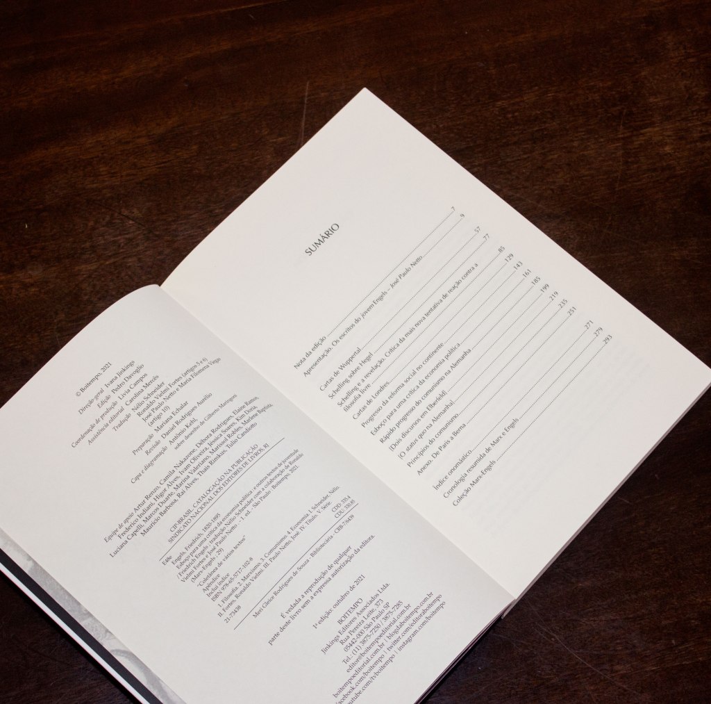 Além do artigo citado, outros dez compõem a coletânea, sendo oito inéditos em português. Aos artigos compilados por José Paulo Netto, escritos durante a juventude de Engels – de 1839, quando tinha dezenove anos, a 1847, véspera da redação do Manifesto Comunista –, soma-se um relato de viagem que o autor fez a pé da França à Suiça. Registram-se ali seu vibrante bom humor e o contato com os camponeses que lhe permitiu prever a ascensão de Luís Bonaparte. Netto também assina a apresentação, que faz um belíssimo resumo biográfico de Engels à época, sua formação e seu encontro e colaboração com Karl Marx ao longo da vida, além de uma detalhada contextualização da produção do período, por meio de vastas notas de rodapé com indicações bibliográficas úteis para leigos e estudiosos.