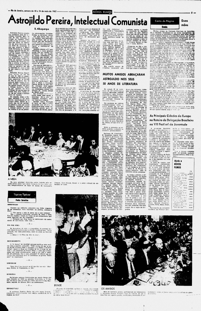 Nas fotos abaixo estão registrados momentos do banquete oferecido a Astrojildo por um número expressivo de representantes da intelectualidade carioca, em 12 de maio de 1962, por ocasião dos 50 anos de sua atividade jornalística. Em lugar de honra, à sua esquerda, encontro-me eu, filha de Luiz Carlos Prestes, que me pedira para representá-lo, uma vez que, devido às suas atividades partidárias, estava fora do Rio; Novos Rumos, o jornal legal do PCB, publicou uma página inteira dedicada à efeméride,12 revelando a admiração e o respeito que Prestes e a direção do PCB tinham pela personalidade de Astrojildo Pereira.13