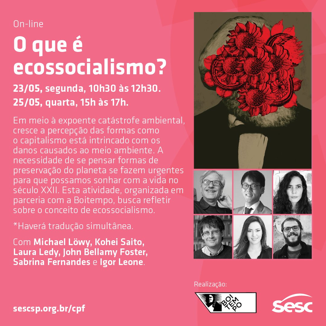 Não perca o curso “O que é ecossocialismo?”, realizado pelo SESC em parceria com a Boitempo, online e gratuito, que acontecerá via Zoom. É necessária inscrição prévia, que pode ser feita até o dia 21 de maio, ou quando acabarem as vagas. Clique aqui para se inscrever!