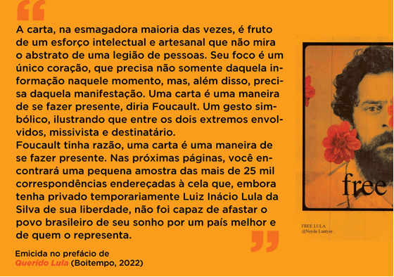 De 7 de abril de 2018 a 8 de novembro de 2019, o ex-presidente Lula ficou encarcerado na Superintendência da Polícia Federal de Curitiba. Foram 580 dias de cárcere, que marcaram definitivamente o rumo da história pessoal de Lula e também do Brasil: enquanto o país elegia um representante da extrema direita, um acampamento em frente à prisão se formou, organizações nacionais e internacionais lutavam na arena jurídica para reverter as injustas condenações, e milhares de brasileiros e brasileiras se solidarizaram com a situação do ex-presidente, seja por manifestações via internet ou pelo meio de comunicação mais antigo entre nós, as cartas.