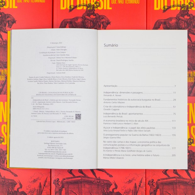 Independência do Brasil: a história que não terminou tem organização de Antonio Carlos Mazzeo e Luiz Bernardo Pericás, artigos de Fernando A. Novais, Herbert S. Klein, Francisco Luna, Vera Ferlini, Pablo Oller Mont Serrath, Sérgio Guerra, Iris Kantor, Pérola Maria Goldfeder de Castro, Marisa Midori, Camila Scacchetti, Guilherme Grandi, Luciana Suarez Galvão, Lincoln Secco, Alexandre de Freitas Barbosa, Alexandre Saes, Roberto Pereira Silva, Osvaldo Coggiola, Antonio Carlos Mazzeo e Luiz Bernardo Pericás, texto de orelha de Rodrigo Ricupero, quarta capa de Carlos Guilherme Mota e capa de Maikon Nery.