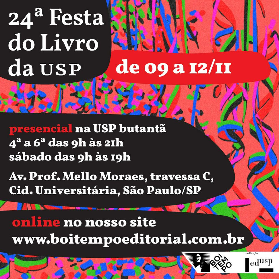 Organizado anualmente pela Edusp desde 1999, o evento procura aproximar editoras e leitores, oferecendo livros de qualidade a um preço muito especial. Neste ano, a tradicional feira volta ao formato presencial entre os dias 9 e 12 de novembro. Pensando em quem não mora em São Paulo, a Boitempo estende a festa também pra loja virtual da editora, no mesmo período.