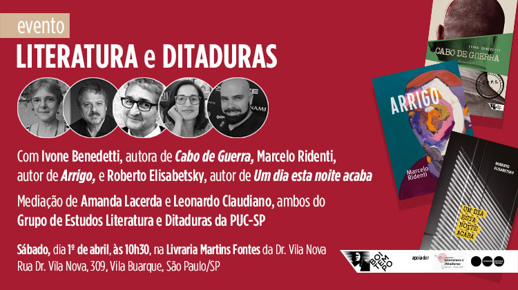Para quem estiver em São Paulo no dia 1º de abril, convidamos para o debate Literatura e ditaduras, com Ivone Benedetti, Marcelo Ridenti e Roberto Elisabetsky. A mediação será de Amanda Lacerda e Leonardo Claudiano (Grupo de Estudos Literatura e Ditadura). Às 10h30 na Livraria Martins Fontes (R. Dr. Vila Nova, 309, Vila Buarque, São Paulo).