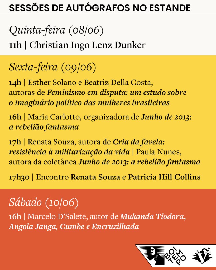 No dia 9, às 15h, haverá uma conversa com Patricia Hill Collins no Palco da praça e logo depois uma conversa entre a autora de Bem mais que ideias e Renata Souza, autora de Cria da favela. Nos demais dias teremos sessão de autógrafos com Christian Dunker, Esther Solano, Beatriz Della Costa, Maria Carlotto, Renata Souza, Paula Nunes e Marcelo D’Salete. Todas as compras no estande da Boitempo ganham marcadores, além de postais especiais em obras de autoras feministas negras e livretos exclusivos em compras acima de R$150. Confira a programação e as informações completas abaixo: