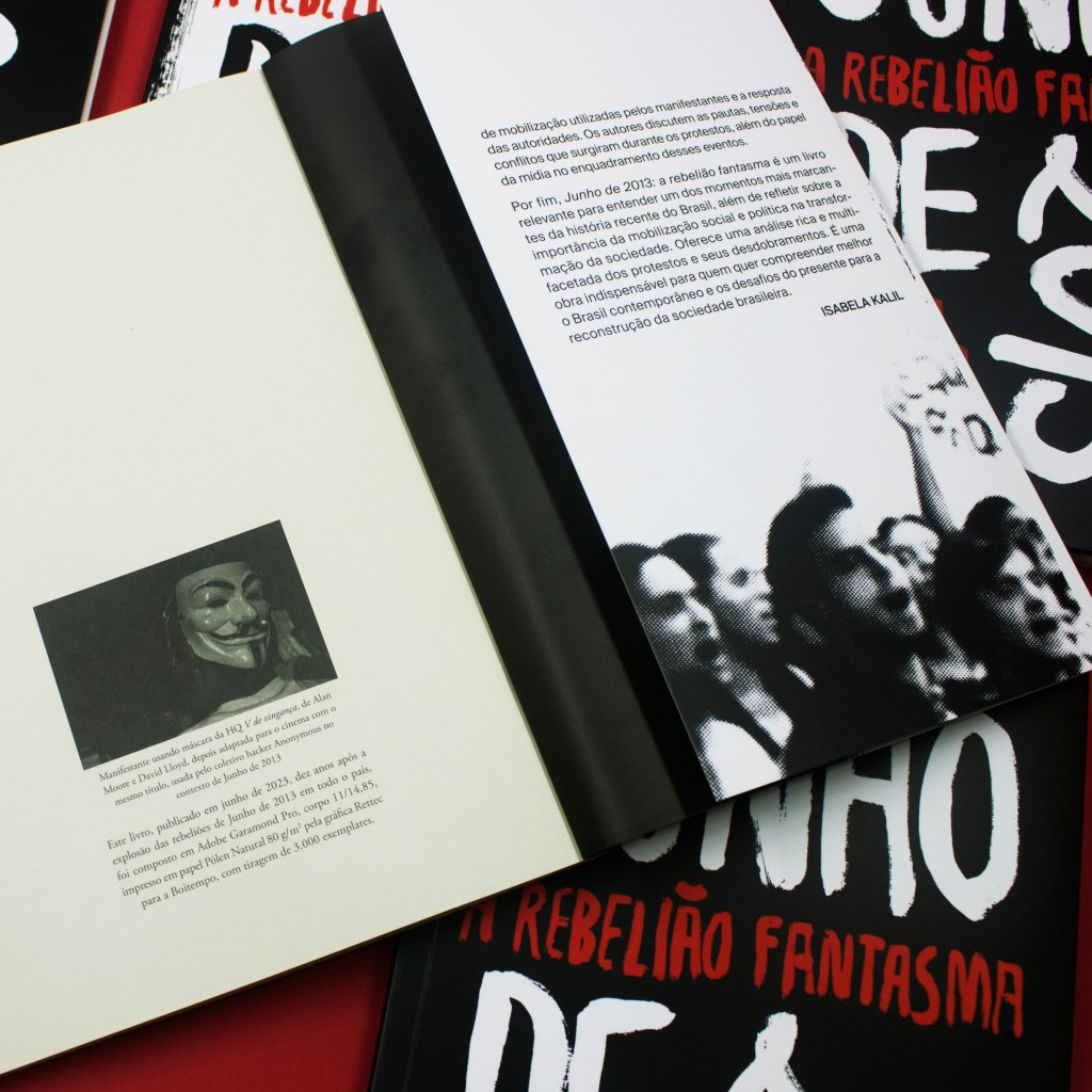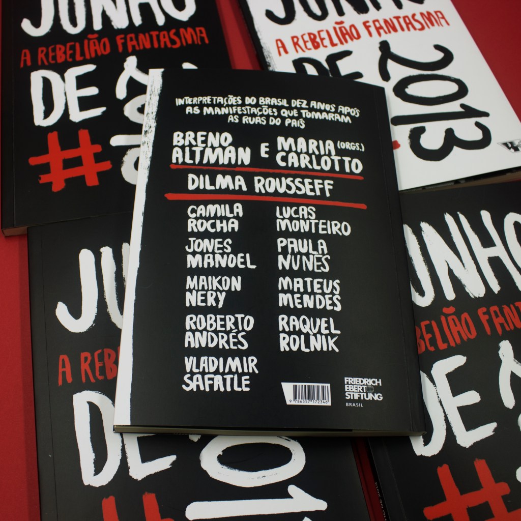 Essas e outras perguntas servem de bússola para os nove artigos e o ensaio visual que compõem a obra Junho de 2013: a rebelião fantasma, organizada por Breno Altman e Maria Carlotto. Além de textos dos organizadores, o livro traz contribuições de Camila Rocha, Jones Manoel, Lucas Monteiro, Mateus Mendes, Paula Nunes, Raquel Rolnik, Roberto Andrés e Vladimir Safatle, prólogo da ex-presidenta Dilma Rousseff, além de fotografias das manifestações feitas por Maikon Nery e texto de orelha de Isabela Kalil. Com diferentes perspectivas, os autores buscam desvendar aquele momento, que se tornou uma das maiores ondas de mobilização social dos últimos anos. A obra tem apoio da Fundação Friedrich Ebert Brasil.