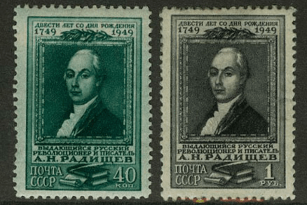 Imagem: Selo da URSS com imagem de Aleksandr Radíschev em comemoração ao seu bicentenário (1949).
