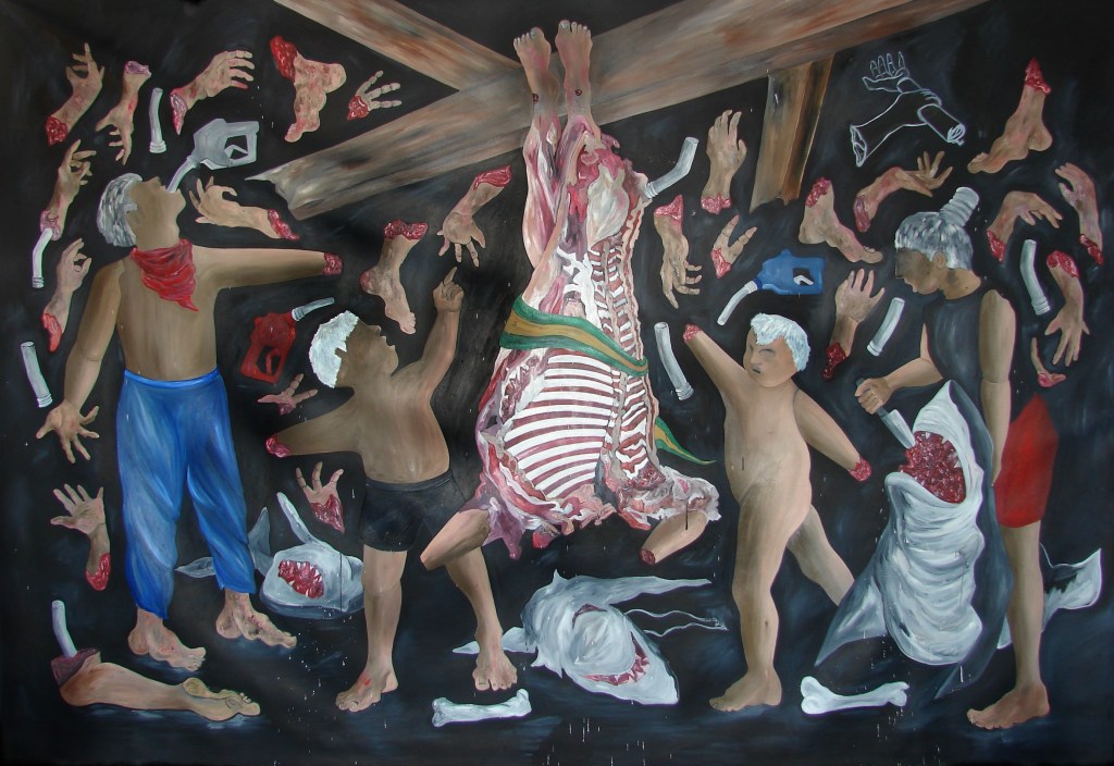 A pintura de Gabriela Fero poderá, no século XXI, alcançar enfim as formas da arte política, que foram tangenciadas no Brasil do século XX, mas não conseguiram ser plenamente assentadas. A arte de gabinete, os tamanhos de tela próprios à apropriação burguesa, servindo como elementos na decoração das casas, as temáticas de gosto universalista, o pitoresco e o grotesco como objetos para públicos consumidores cativos, a pintura sempre da moda e que permite a constante circulação do mercado artístico, tudo isso atravessou impavidamente os variados modos de acumulação e os regimes de regulação do capitalismo. É verdade que nos tempos do fordismo, com o nacional-desenvolvimentismo, a arte pública e o muralismo tiveram no Brasil algum incentivo. No entanto, faltou a pedra de toque do que retratar, e como. A crítica insuficiente resultou na forma insuficiente. Eventualmente o século XXI conhecerá, com Fero, a forma mural plena, a narrativa imagética enfim radical do país e do mundo. O extremo que gerou Guernica a partir de uma tessitura de leitura de mundo sólida em sua indignação e grandemente potente em sua imagética e seu posicionamento de mundo poderá ser – de outro modo, em outras circunstâncias e com outras virtudes e propósitos – o combustível para que Fero seja a pintora decisiva de nossa época.