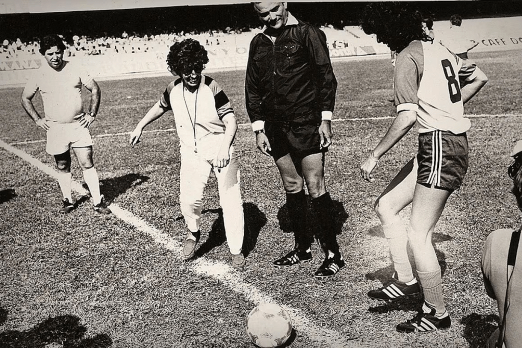 Ruth Escobar e Rose do Rio dão pontapé inicial de jogo no Morumbi, em 1982.