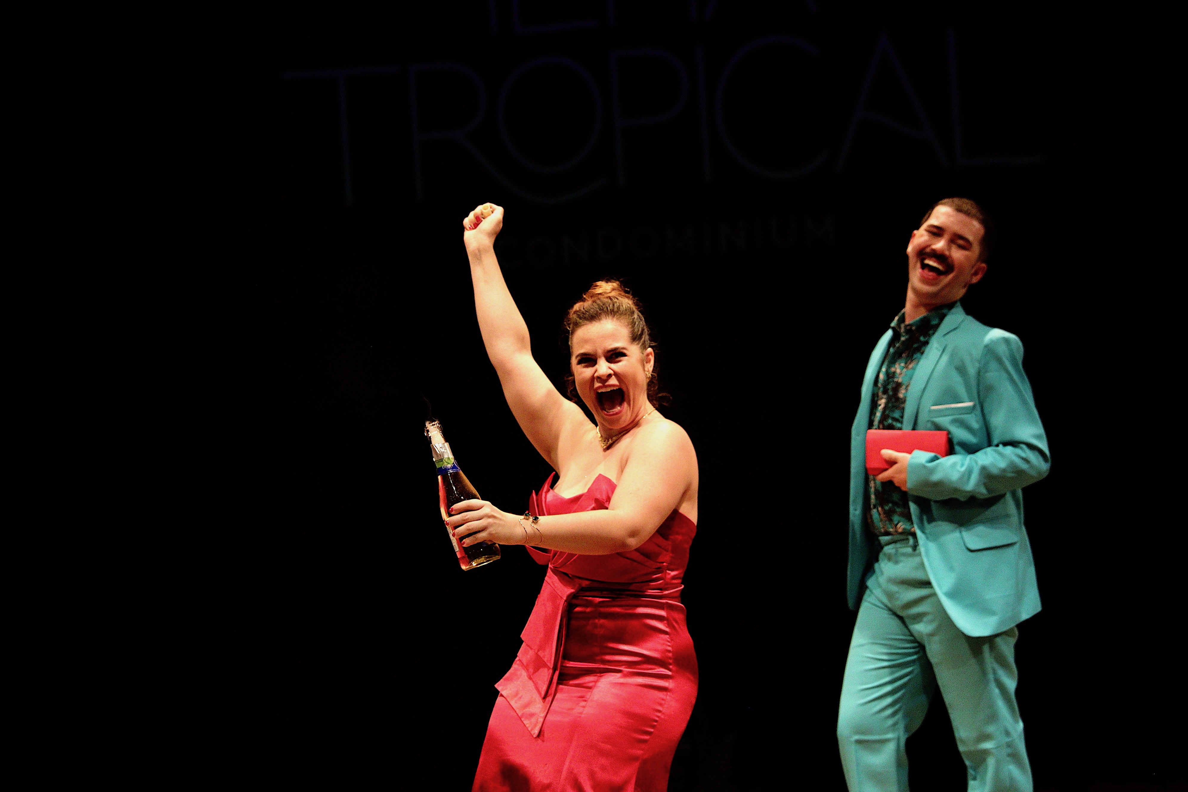 Ao sentarmos nas poltronas de Ilha Tropical, recebidos por champanhe, num clima ultrajante de festa instagramável, somos convidados a entrar no desejado condomínio da burguesia brasileira. Um alegre agitador de festas (Federico Torres) nos causa uma sensação de que não há distancias entre ele e nós, mais que expectadores, somos cúmplices do mal gosto e da violência. Fazemos alegremente parte do ritual que quanto mais expõe os dentes, num riso sardônico, mais revela o caráter assassino dessa “elite”. Aliás, a cenografia, iluminação e músicas compõem o enredo, equilibram cenas, dão impacto às atuações e nos jogam como colaboradores em tudo.