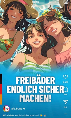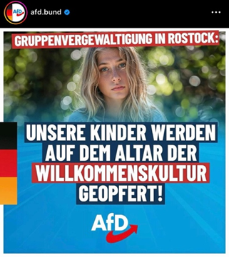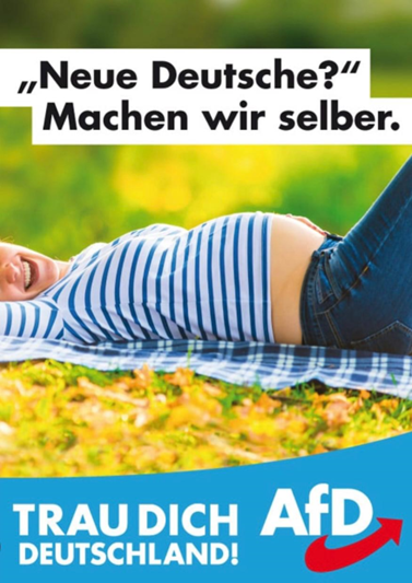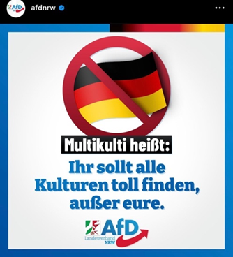 Como se vê, a propaganda da AfD combina uma série de fatores. Ao recorrer ao slogan feminista “meu corpo, minhas regras”, inverte-o, (como faz a propaganda bolsonarista no Brasil), equiparando o corpo feminino ao território, para promover a islamofobia e negar às mulheres islâmicas o direito ao seu próprio corpo. O corpo não é mais o corpo individual das mulheres, mas a terra, comandada por seus proprietários, que têm direito “natural” a ela. Ao acusar o gasto associado à imigração por ser, como a guerra, uma fonte de déficit para a seguridade social – algo muito presente nessa última campanha para o parlamento, que pediu o fim do pagamento de benefícios sociais e atacou fortemente o subsídio para cursos de línguas para os imigrantes, o que é também uma forma de exclusão – , a propaganda restringe somente aos alemães “puro sangue” o direito à seguridade social. Cada vez mais a AfD defende que pessoas não brancas que possuem a cidadania alemã não são de fato cidadãos e cidadãs. A propaganda, mais antiga, dos “Novos Alemães? fazemos nós mesmos”, alude justamente a essa diferenciação dos “alemães por cidadania” (os novos alemães) e os alemães “de verdade”, “pelo sangue e pela raça” – o que, remete ao lema “sangue e solo”, revelando, assim, o caráter neonazista desse movimento. A teoria da conspiração da “grande substituição” de alemães por outros povos, de brancos por negros, e o medo do fim da “raça alemã” são temas hoje abertamente discutidos nos Natais, festas de família e amigos. Em uma festa recente em Frisia, uma série de jovens foram filmados fazendo a saudação nazista [Sieg heil] e cantando: “Fora estrangeiros: A Alemanha para os alemães”, frase utilizada por Adolf Hitler. O ataque à esquerda que considera o nome Mohammed como uma referência à religião (“a Alemanha se tornou mais espiritual”) e não à raça revela justamente como raça, cultura e religião são reunidas na islamofobia da AfD. Ademais, há uma associação cada vez maior nessa propaganda ao aumento dos crimes na Alemanha, como demonstra o meme que associa um estupro coletivo à imigração. Proteger mulheres e crianças também é tema constante de vídeos e fotos no Instagram. Por fim, vale comentar como a crítica ao multiculturalismo também revela um problema histórico da Alemanha: pode-se gostar de qualquer cultura, menos da sua própria, pois essa foi banida pela “política da memória”. A AfD reescreve a história da Alemanha, restaura o orgulho perdido com a derrota militar do país e revela que essa derrota militar não se traduziu, no longo prazo, numa derrota das ideias nazistas.