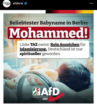 Todas essas propagandas, circuladas no Instagram, mostram como a AfD explorou a crise dos Verdes e obteve sucesso em reverter a pauta da crise climática (como se viu nas pesquisas e nas urnas). Como na pandemia, que preparou o terreno em muitos aspectos para essa ascensão, a AfD sustentou um discurso de combate ao pânico. Vale dizer que a Alemanha tem políticas de natalidade para lá de complicadas de uma perspectiva feminista e, para a extrema-direita, o incentivo à família envolve a manutenção da identidade e da raça alemãs. O cenário apocalíptico do clima ou, como eles propagandeiam, a “histeria climática”, estaria contribuindo para a decância do povo alemão.