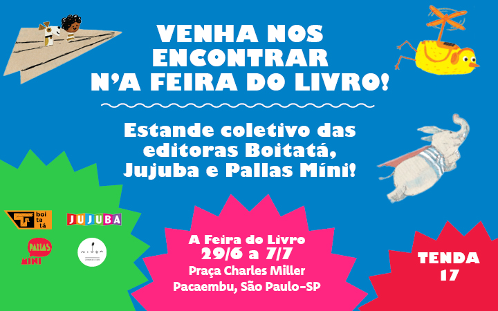 A Boitatá estará presente em um estande compartilhado com as editoras Jujuba e Pallas, com eventos para pequenos e pequenas. Vai ter contação de histórias e muito mais!