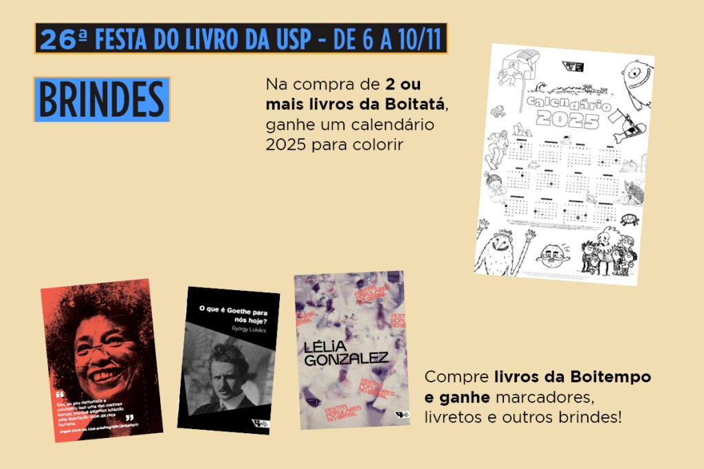 E tem mais! Além dos livros, a Boitempo vai levar seu calendário de mesa 2025 e belíssimas sacolas ecobags durante o evento. Nas compras de livros da Boitempo, ganhe marcadores, livretos e outros brindes! E na compra de 2 ou mais livros da Boitatá, ganhe um calendário 2025 para colorir.