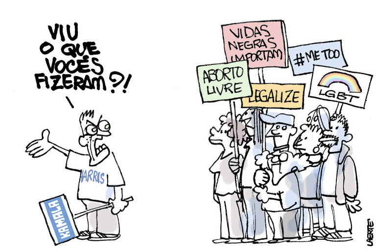 A Folha publicou charge de Laerte sobre as eleições nos Estados Unidos. Mostra um grupo de defensores de “minorias” com cartazes em defesa de suas pautas — mulheres, negros, LGBTs e pregadores da liberação da maconha. Na frente deles, um apoiador de Kamala Harris, um homem branco provavelmente de meia idade, diz, irritado: “Viu o que vocês fizeram?”