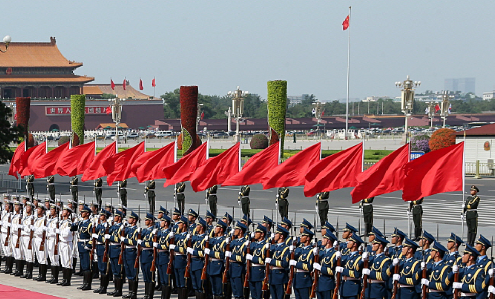 A Guarda de Honra da China, composta conjuntamente pelo Exército, Marinha e Força Aérea chinesas em frente ao Grande Salão do Povo, no centro de Pequim. (Imagem: Cheong Wa Dae/Wikimedia Commons, 2013.)
