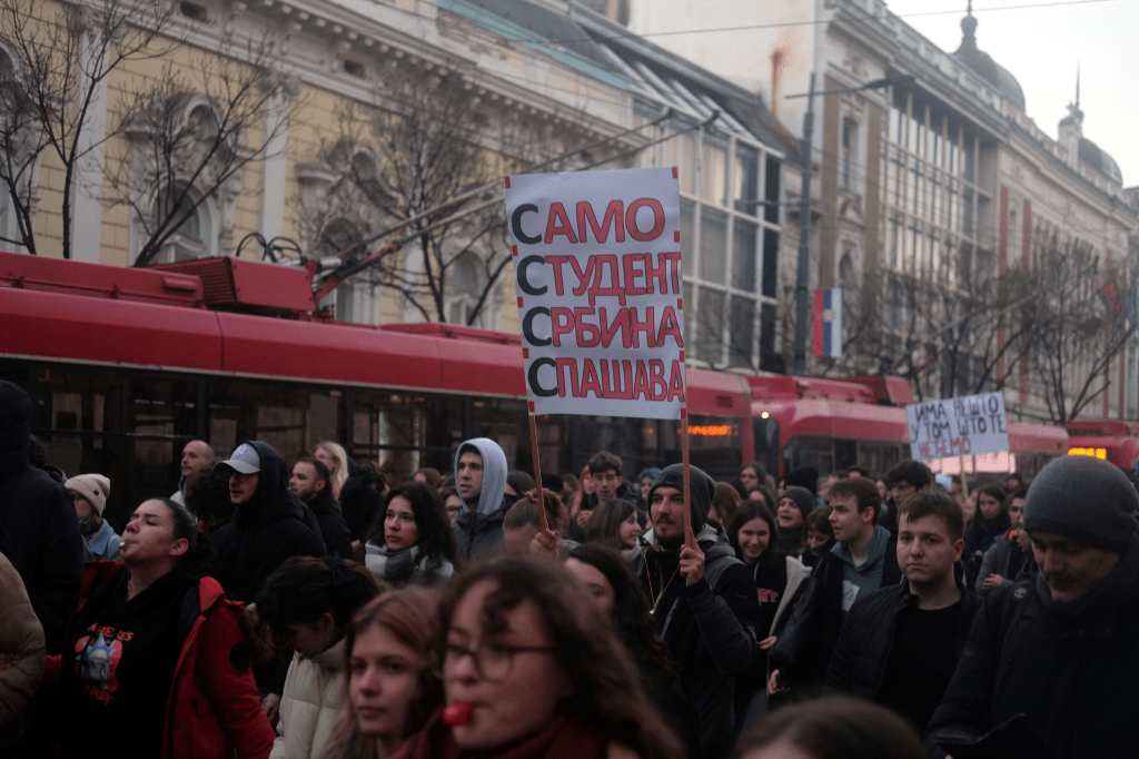 Manifestação estudantil ocorrida em fevereiro de 2025, em Belgrado. Foto: WikiCommons