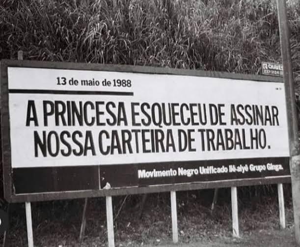É por isso que em em 1988, no centenário da abolição, com um outdoor e durante uma passeata, o Movimento Negro Unificado exibiu a frase “A princesa esqueceu de assinar nossa carteira de trabalho”. O slogan criticava o fato de a abolição da escravidão não ter sido acompanhada de medidas que garantissem direitos trabalhistas e econômicos aos ex-escravizados. E permanece tão atual quando vivemos a discussão da redução da jornada de trabalho e o fim da escala 6×1. Diante das jornadas exaustivas e de tanta precarização, podemos atualizar a frase para: “A princesa esqueceu de assinar nossa carteira de trabalho, e o patrão tem nos explorado na escala 6×1”. Muitos seguem até sem carteira, no trabalho informal e com a pejotização das vagas, sem direitos, sem proteção, sem salários dignos para a maioria.