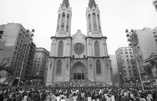 Missa em homenagem a Vladimir Herzog, que reuniu 8 mil pessoas na Praça da Sé, em São Paulo, no dia 31 de outubro de 1975. Foto: WikiCommons.