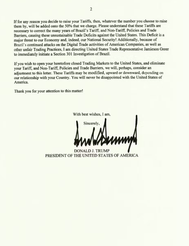 No fim do documento, em tom protocolar, o fechamento caso o governo brasileiro decida cooperar (e já não sabemos se cooperar é anistiar Bolsonaro, alterar tarifas, deixar sem restrição a atuação das Big Techs ou transferir o gado da JBS e as jazidas da Vale para o Texas): “Você nunca ficará desapontado com os Estados Unidos da América” — lida da América Latina, a frase explode carregada de “ironia objetiva”. Em seguida, a assinatura do presidente Trump ocupando boa parte da folha e feita com caneta marcador preta — com feitio arrogante e infantil.