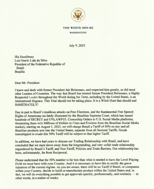 “[…] Como é de seu conhecimento, não haverá nenhuma tarifa se o Brasil ou empresas de seu país decidirem construir ou fabricar produtos nos Estados Unidos e, na verdade, faremos todo o possível para obter aprovações de forma rápida, profissional e rotineira – em outras palavras, em questão de semanas.”