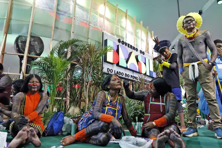 Indígenas na Área Verde (Green Zone), espaço aberto ao público, da COP30. A programação principal do evento e tomada de decisões ocorre na Blue Zone, área restrita a credenciados. Foto: Bruno Peres/Agência Brasil