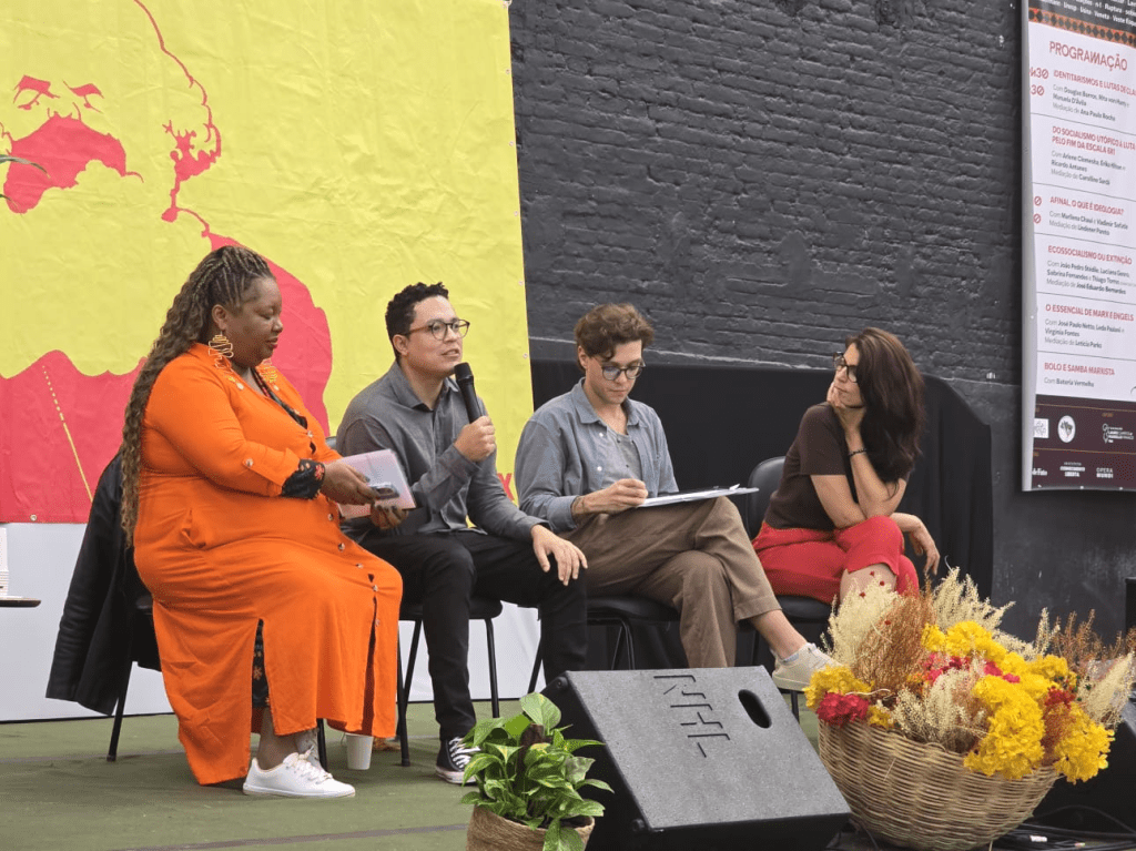 Da esquerda à direita: Ana Paula Rocha, Douglas Barros, Rita von Hunty e Manuela D’Ávila durante o debate “Identitarismo e luta de classes“, parte da programação da Festa de Aniversário do Marx em São Paulo, ocorrida em maio de 2025. Foto: Caroline Oliveira/Brasil de Fato
