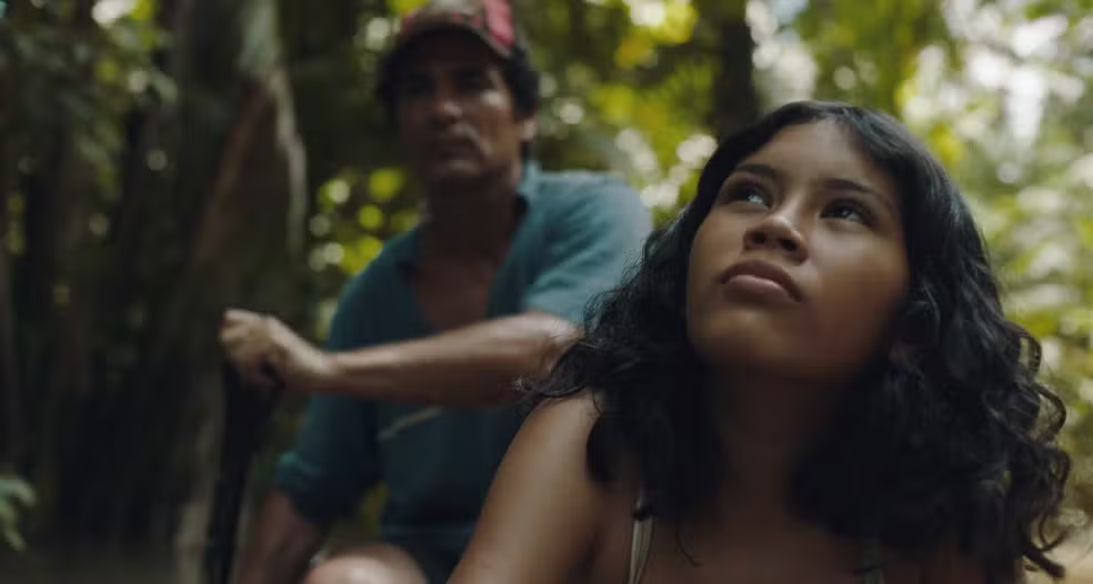 O abuso intrafamiliar é colocado na mesa e, a partir de então, o filme assume uma atmosfera asfixiante, pois assim como a jovem protagonista percebemos gradativamente que todas as pessoas ao redor não apenas sabem o que acontece como já estão resignadas diante da rotina perversa de violência contra as meninas e mulheres. “Não é só com você que acontece isso. Daqui a pouco você cresce e vai embora daqui, como sua irmã”, diz Jaci (Ingrid Trigueiro) quando Tiele lhe conta que seu pai a levou para caçar. Irmã que lhe diziam ter ido buscar uma vida melhor na cidade, mas que ela descobre ter sido vítima do mesmo abuso. Ali todos falam em códigos, se sustentam silêncios, os olhares transbordam medo, angústia e tristeza. Agora Tiele vê. E o público lê as expressões em close-ups arrebatadores.
